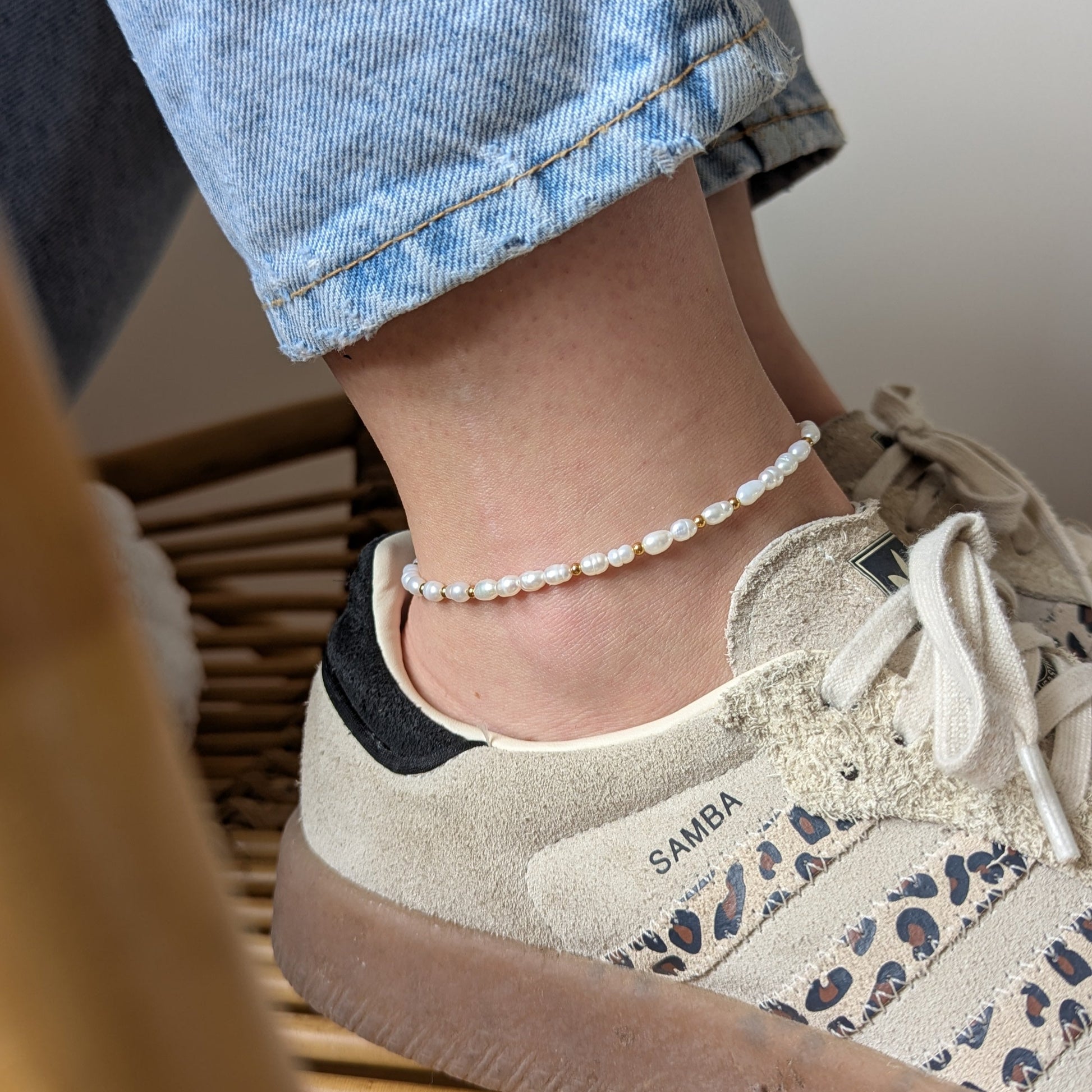 Clairement, notre creation chouchou ! Découvrez notre bracelet de cheville Ariel, une pièce délicate ornée de perles d'eau douce naturelles et de petites perles dorées.